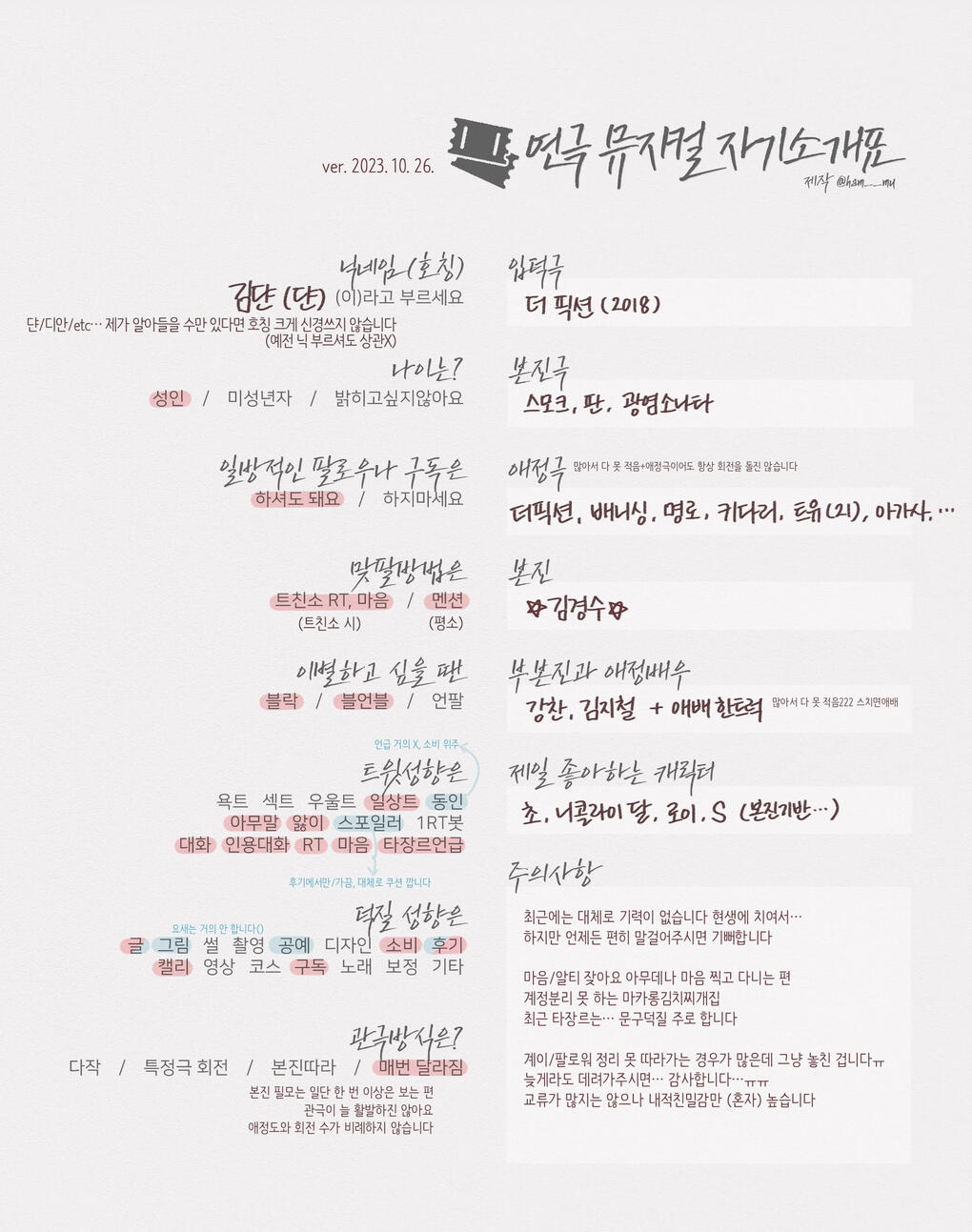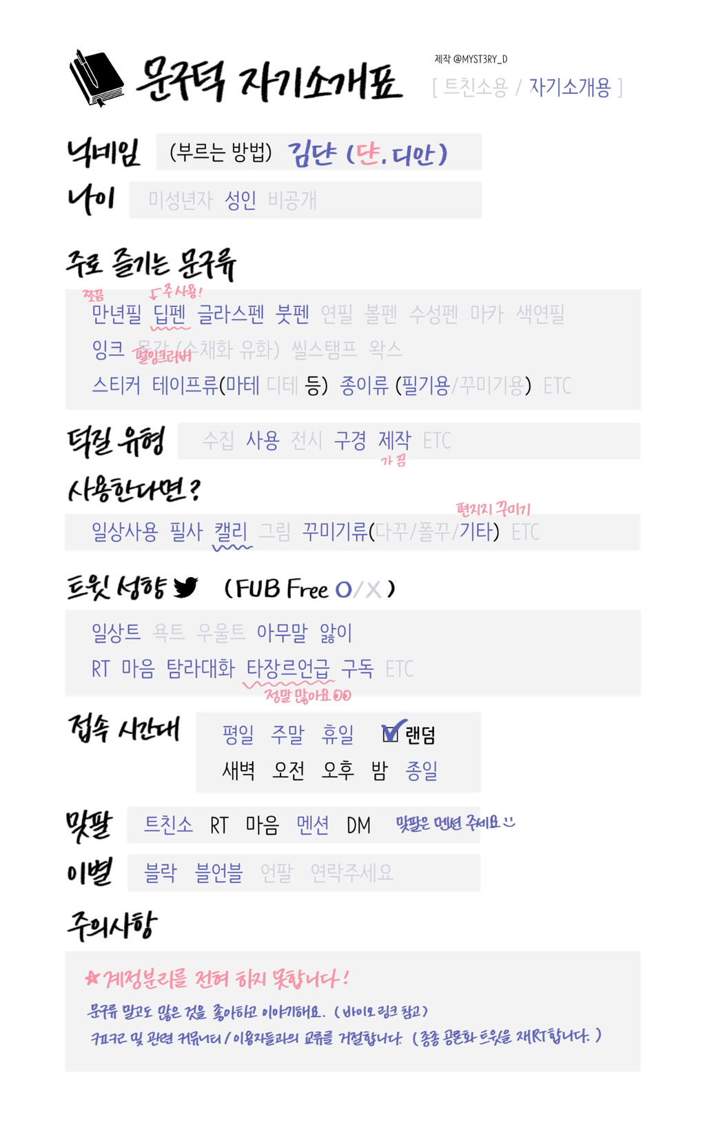 댠, 디안, 디안느. 댠님 댠댠님 편하신 대로 불러주세요.성인 여성입니다. 페미니스트.세상에서 제일 못하는 것 = 계정분리. 오만 가지 잡다한 분야에 관심을 둡니다. 본 소개 페이지와 메인 트윗 타래 참고! 일상적인 이야기와 아무말도 아주 많답니다. 혼자 잘 떠들어요.연뮤 문구 캘리 타로 게임 성우 애니 웹툰 소설 드라마 영화 가수 암튼 뭔가 많이 좋아함 + 꾸준히 늘어나는 중!